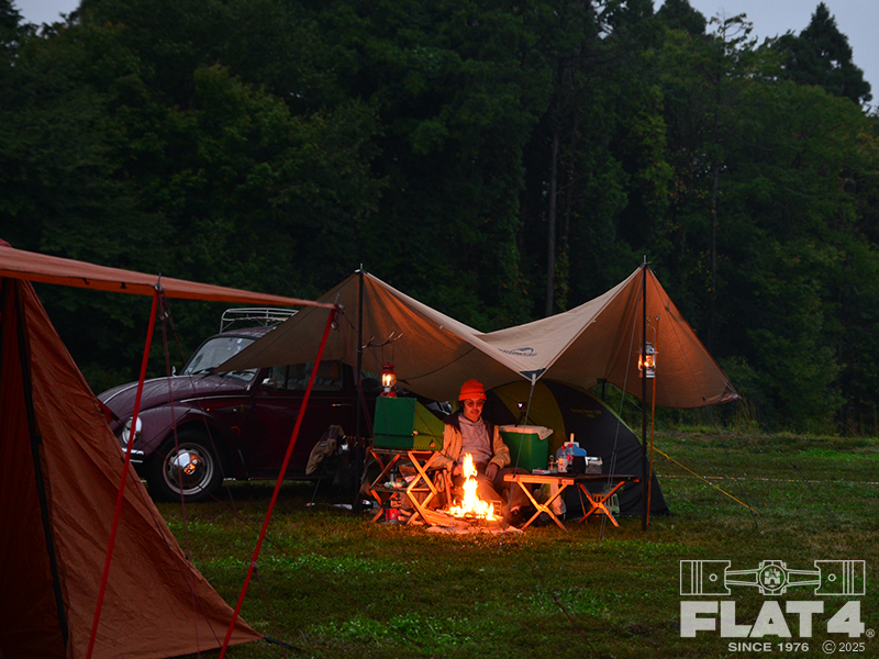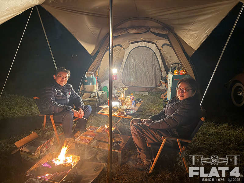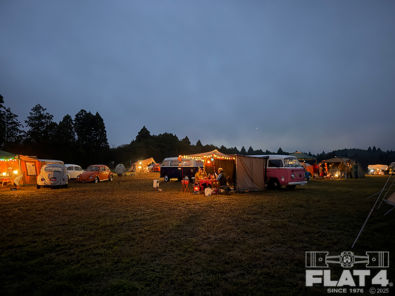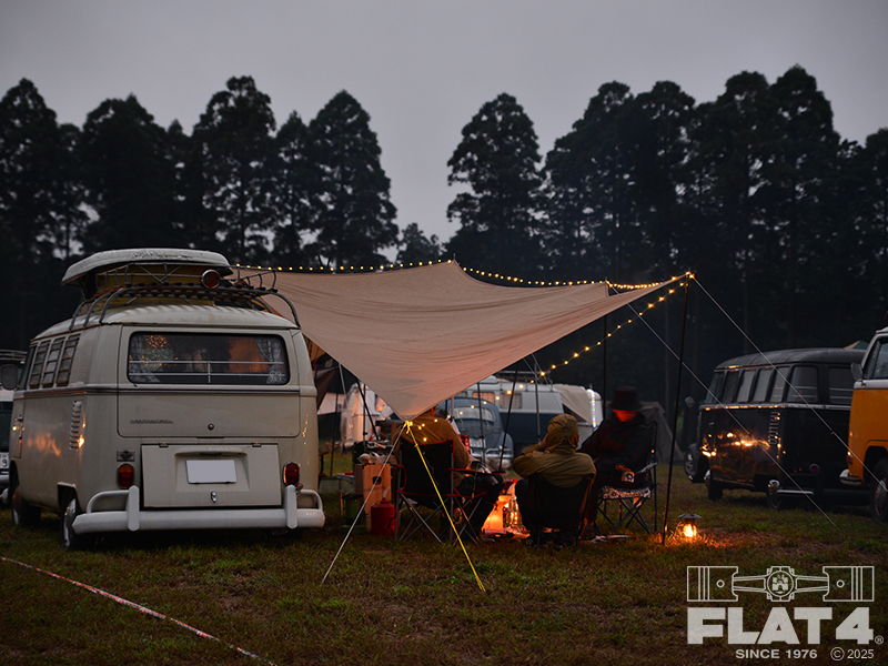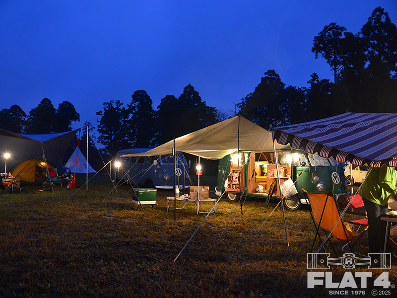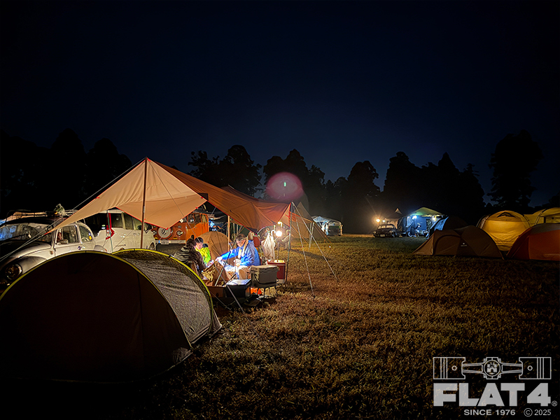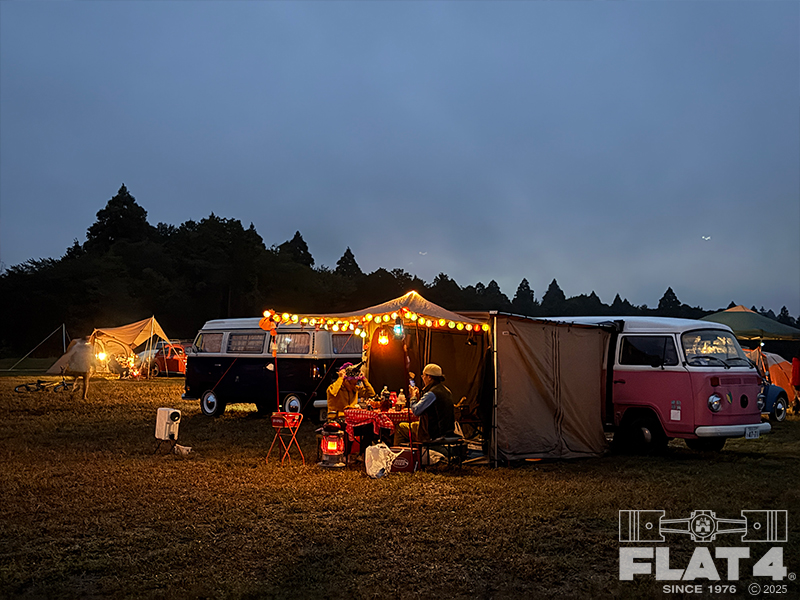 仲間と語らいながら食事やお酒を楽しむ時間は格別です。それぞれのテントから笑い声がこぼれ、「VINTAGE VW FIELD 2025」初日の夜が更けていきました。