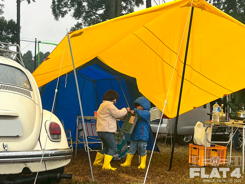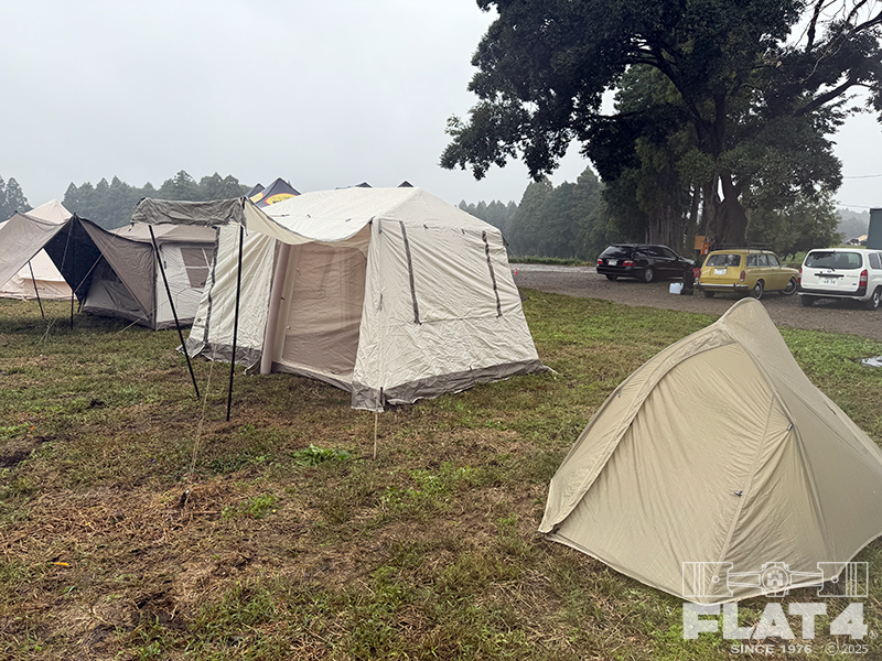 受付を済ませた後、芝生のフィールドが広がる2DAYS キャンプエリアに入場。愛車を好きな場所に止めた後は早速テントやタープを張り、雨の中でもスムーズに設営されていました。