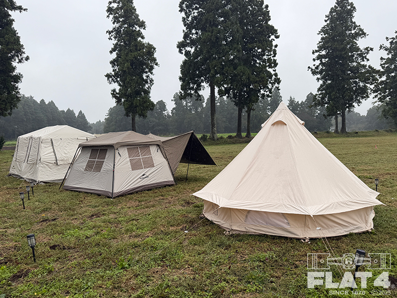 これらのテントはスタッフが実際に宿泊でも使用させていただき、その快適さを体感。雨の中でも心地よく過ごせる高品質なギアに改めて感動しました。