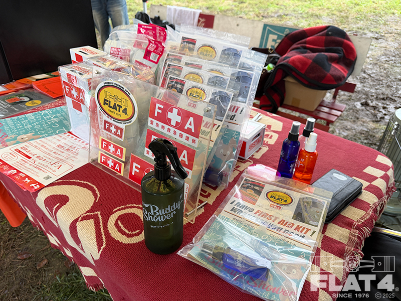 FLAT4 オリジナルFA (First Aid) KITの企画・販売においてご協力いただいている「非営利型一般社団法人 FA普及協会FAVT」(https://fa-csr.jp/)様のブースも併設。残念ながら中止となった「ドッグドラッグ」にエントリーしていただいていた方々とじゃんけん大会を行い、ペット用の除菌消臭スプレー「バディシャワー」や「4FOOT4株式会社」(www.4foot4.com)様からのペット用グッズがプレゼントされ、参加された方は喜ばれていました。