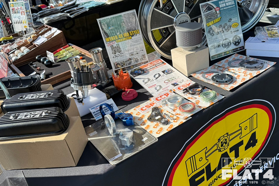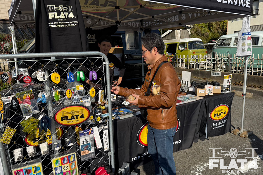 FLAT4ブースでは、リニューアルしたアルミバブルカバーやFLAT4 ENKEI 5スポークホイール、NEW ITEMのGERMAN CSP製イグニッションコイルブラケット等を中心に販売。
