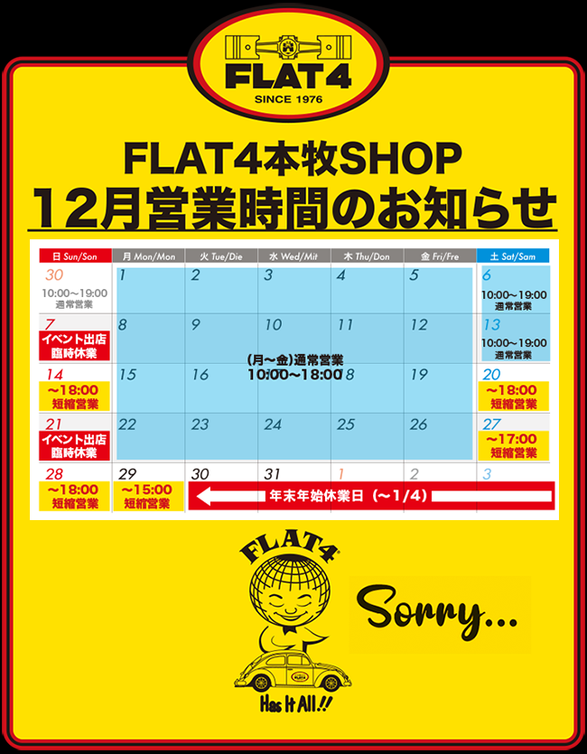 FLAT4本牧ショップでは、誠に勝手ながら各種イベント出店、年末年始休業等により12月の営業時間を上記の通りとさせていただきます。