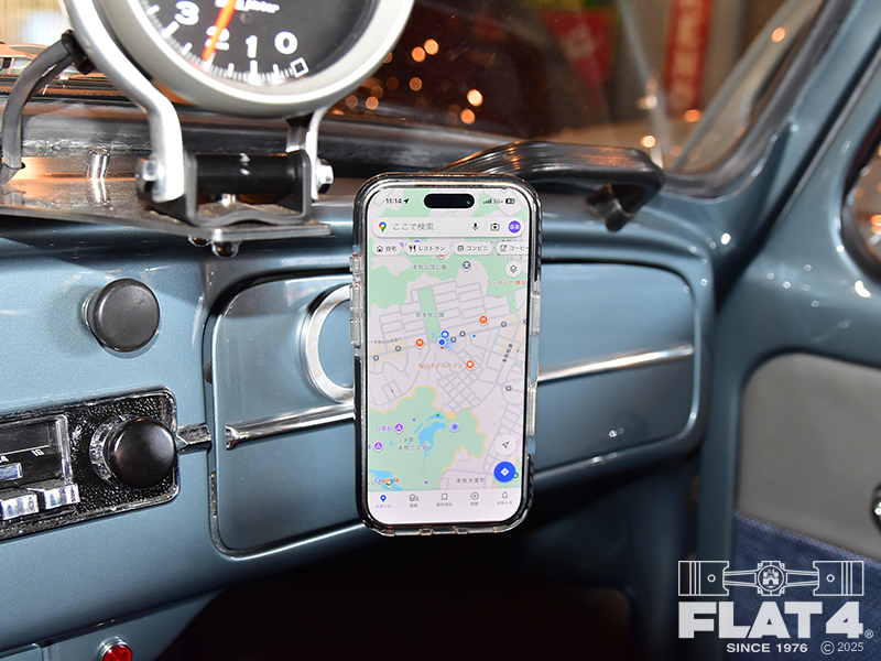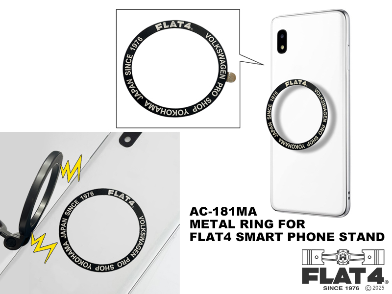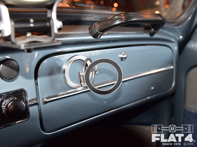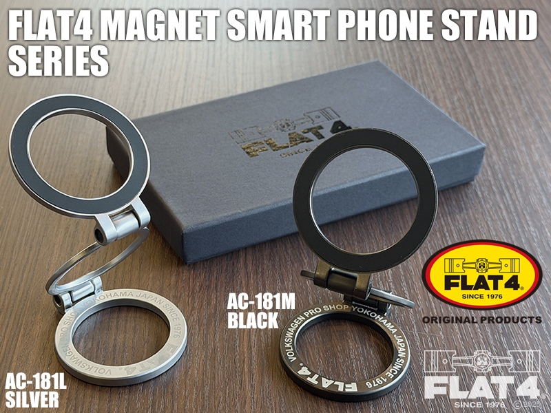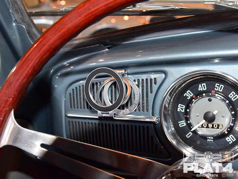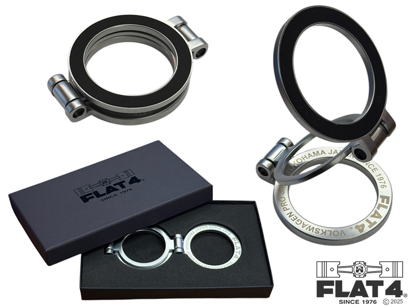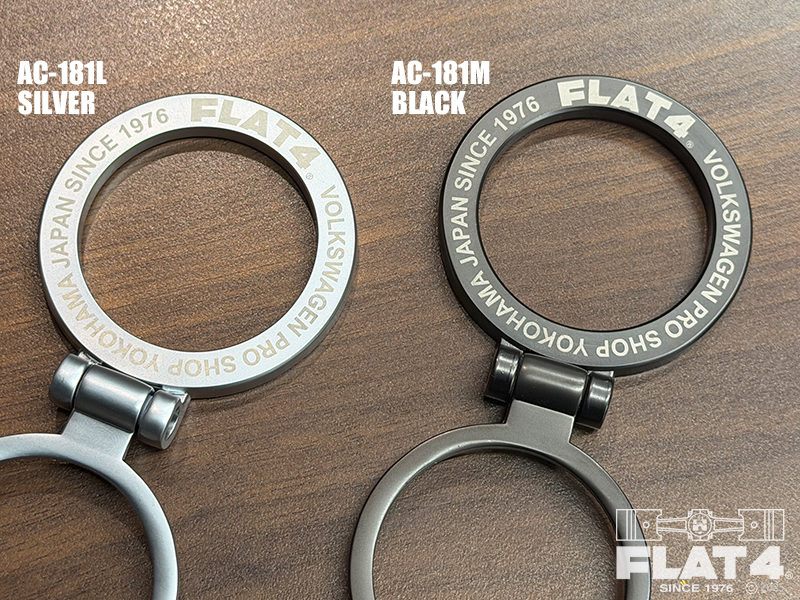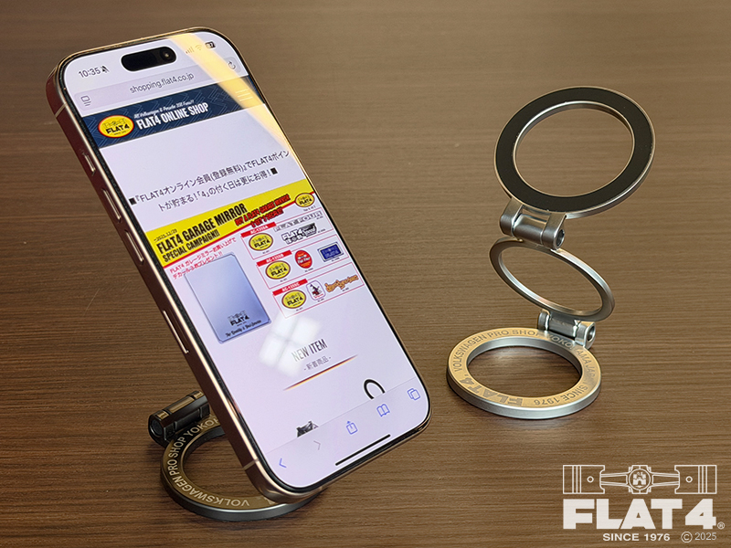 アルミ合金製の2つのリングで構成されるFLAT4 マグネットスマートフォンスタンドは、ブラックバージョン(AC-181M)に続き、新たにシルバーバージョン(AC-181L)がラインナップに加わりました。空冷VWのダッシュまわりの雰囲気を損なわないシンプルなデザインが好評で、発売以来、FLAT4オリジナルプロダクツの中でも 2025年のベストセラーアイテムとなっています。