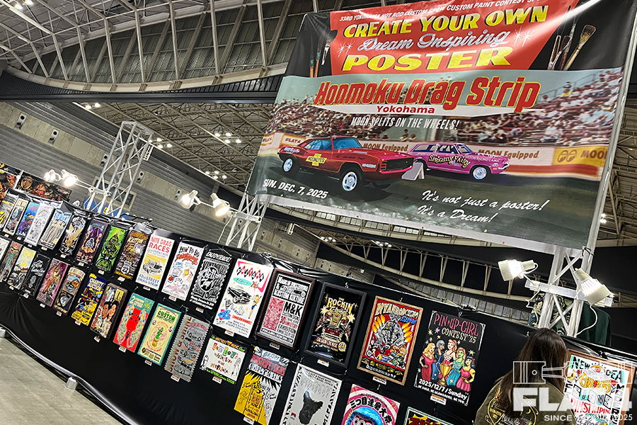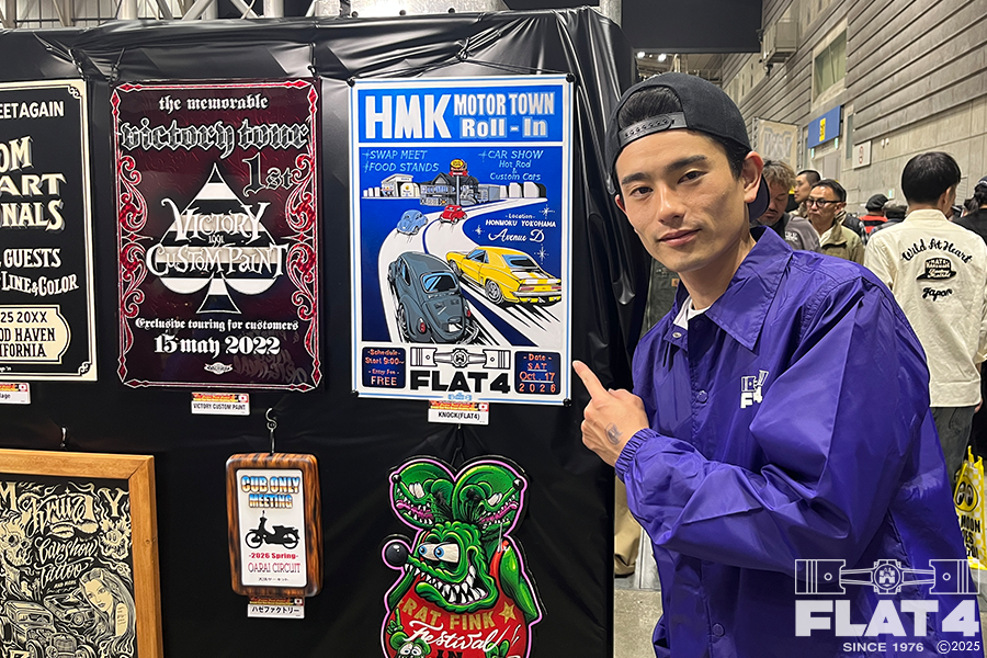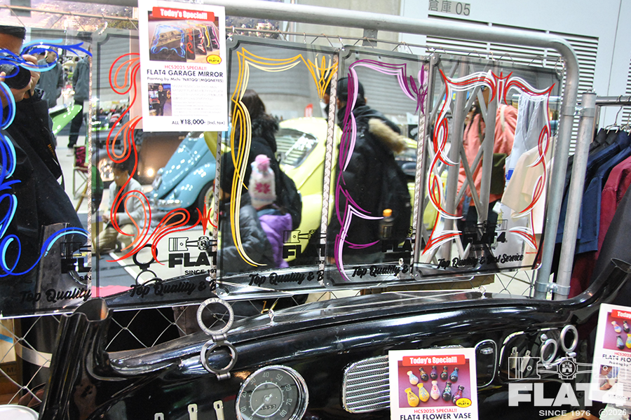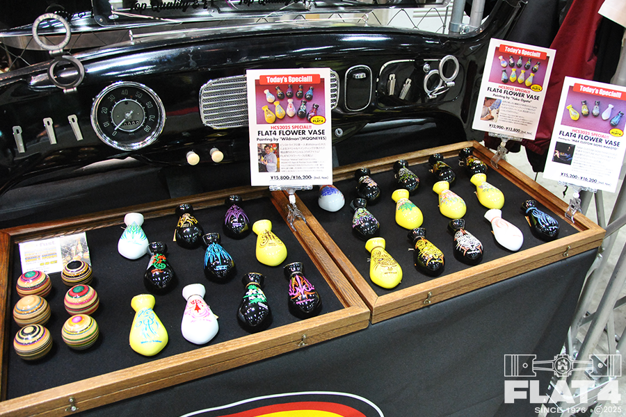 また、今回のイベントに向けてプロピンストライパーであるMOONEYES”Wildman石井”氏、M & K CUSTOM SIGNS “MAKOTO”氏、”Yoko Ogata”氏に描いていただいた『スペシャルFLAT4フラワーベース』や、MOONEYESの若きピンストライパー”NATQQ”氏によるピンストライプが描かれた「FLAT4ガレージミラー」もゲートオープンと同時にご来店され購入されるなど大人気のアイテムでした!