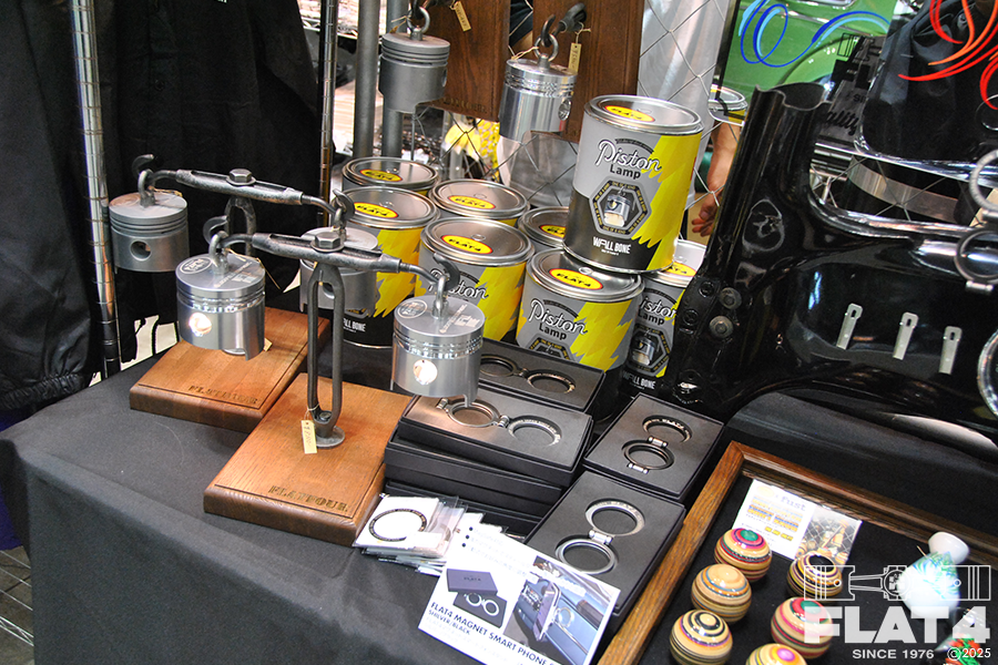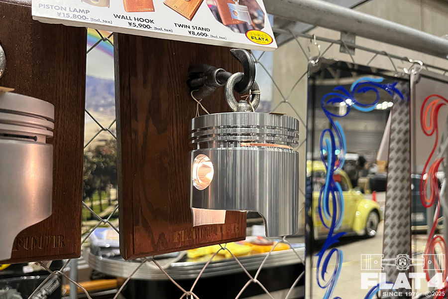 そして、今回、スペシャルアイテムとして先行販売を行ったこちらの「ピストンランプ & メタルハンガー」は、実際の空冷VWに使用していた85.5mmピストンを加工し、USB充電できるLEDランプを搭載しているため、手軽に個性的なランプを演出可能!