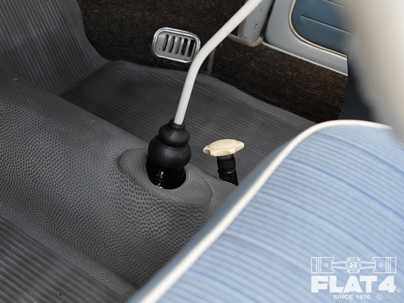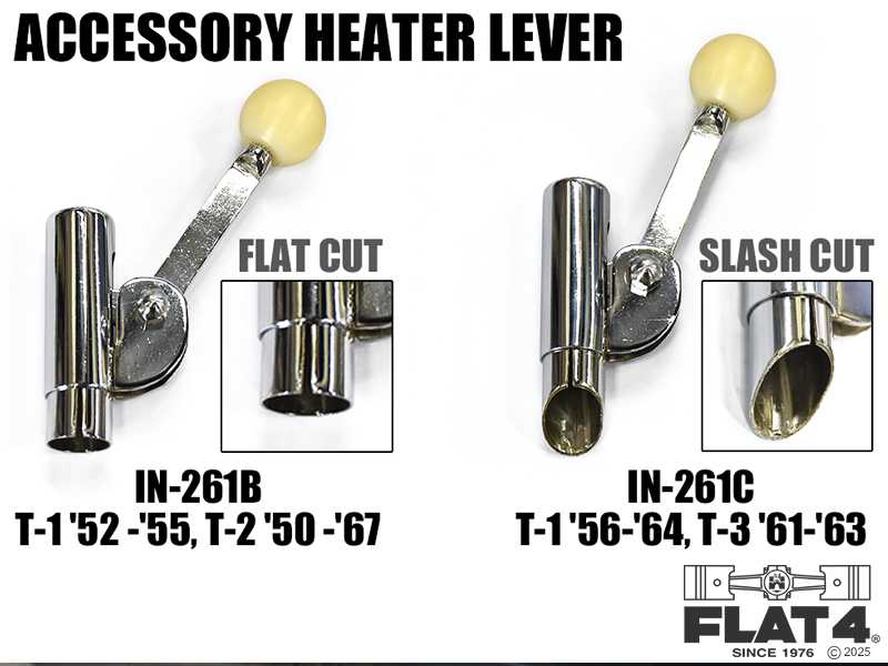 しかし、ヒーターを全閉から全開(またはその逆)にするにはダイヤル式のノブを何周も回す必要があり面倒です。そこで’50~’60年代当時、VeeWacoというメーカーからダイヤル式のヒーターコントロールシステムをレバータイプにグレードアップする”アクセサリーヒーターレバー”がリリースされていました。レバーを上下に動かすだけでヒーターの開閉が操作できる優れモノで、当時のオリジナルは中々手に入りませんが、FLAT4では忠実に再現されたリプロダクションをラインナップしています。