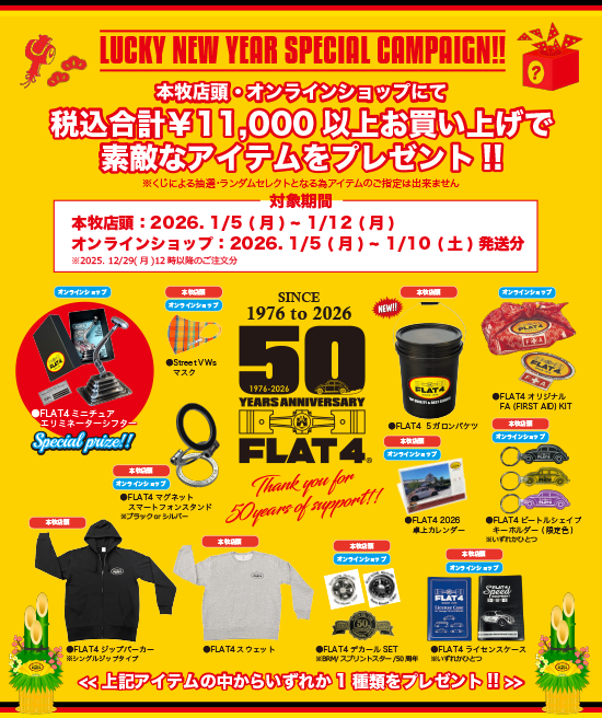 2026年にFLAT4 50周年を迎えるのを記念し、日頃ご愛顧いただいている皆様への感謝の気持ちとして、2026年新年キャンペーンを開催致します!