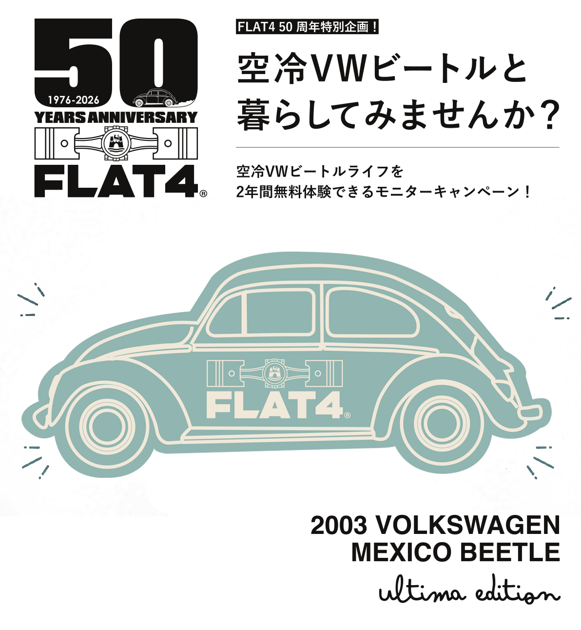 FLAT4が整備・メンテナンスした空冷VWビートルを、1組限定で2年間無償貸与。