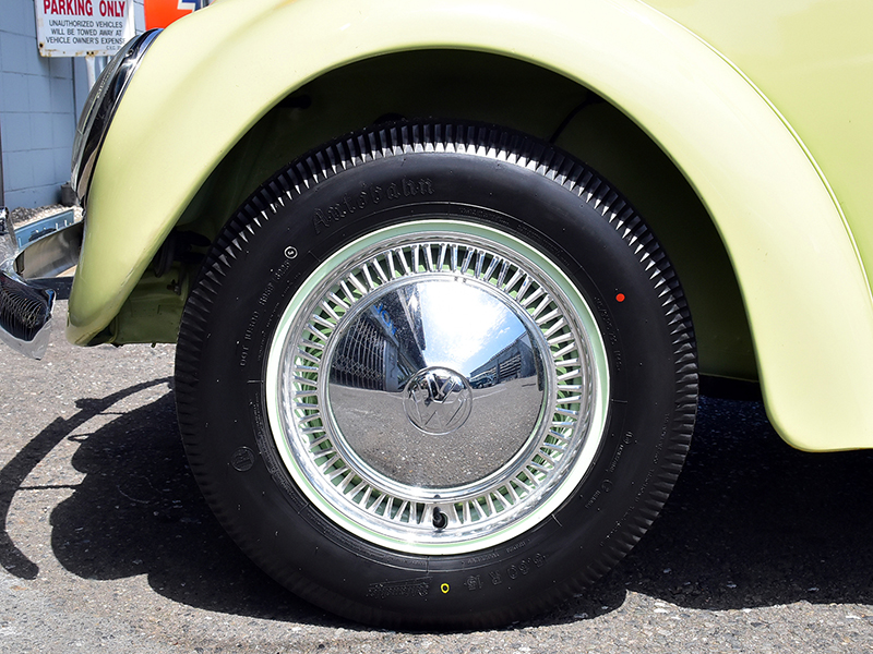 VW純正スティールホイールはVW純正オリジナルカラーでペイントし、当時の貴重なGERMAN ホイールトリムリングをセット。新品のAUTOBAHN バイアススタイルラジアルタイヤを装着しました。