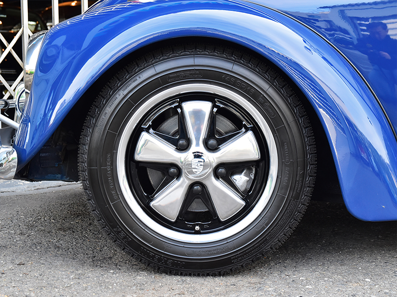 足元にはFLAT4 911スタイルホイールのブラックペイントバージョンを装着し、フロントに4.5J、リアにリニューアルしたばかりの6J DEEPをセット。タイヤはフロントにMICHELIN XZX 145SR15、リアにMICHELIN XWX 185/70R15とし精悍な”CAL-LOOK”に仕上げました。