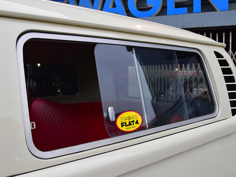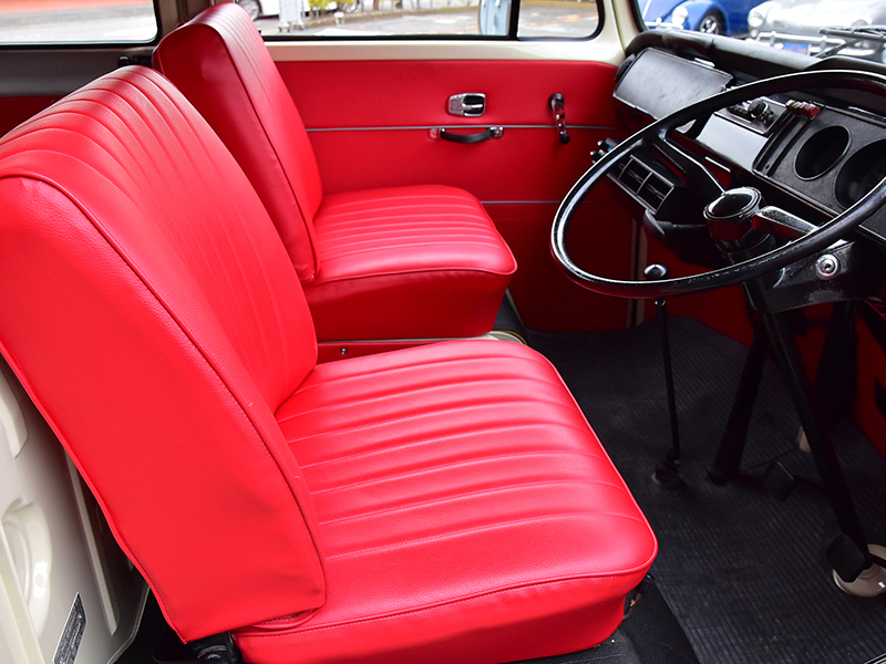 ボディはVW純正色のロータスホワイト(L-282)にて外装ニューペイントを行い、インテリアはレッドバイナルレザーのシートカバー&ドアパネルとなります。